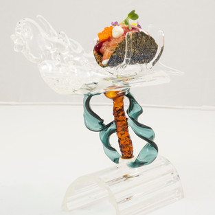 Izq. Mejilla de res, zanahorias, paté de pato y maracuyá; Drcha.Pollo escalmendrado